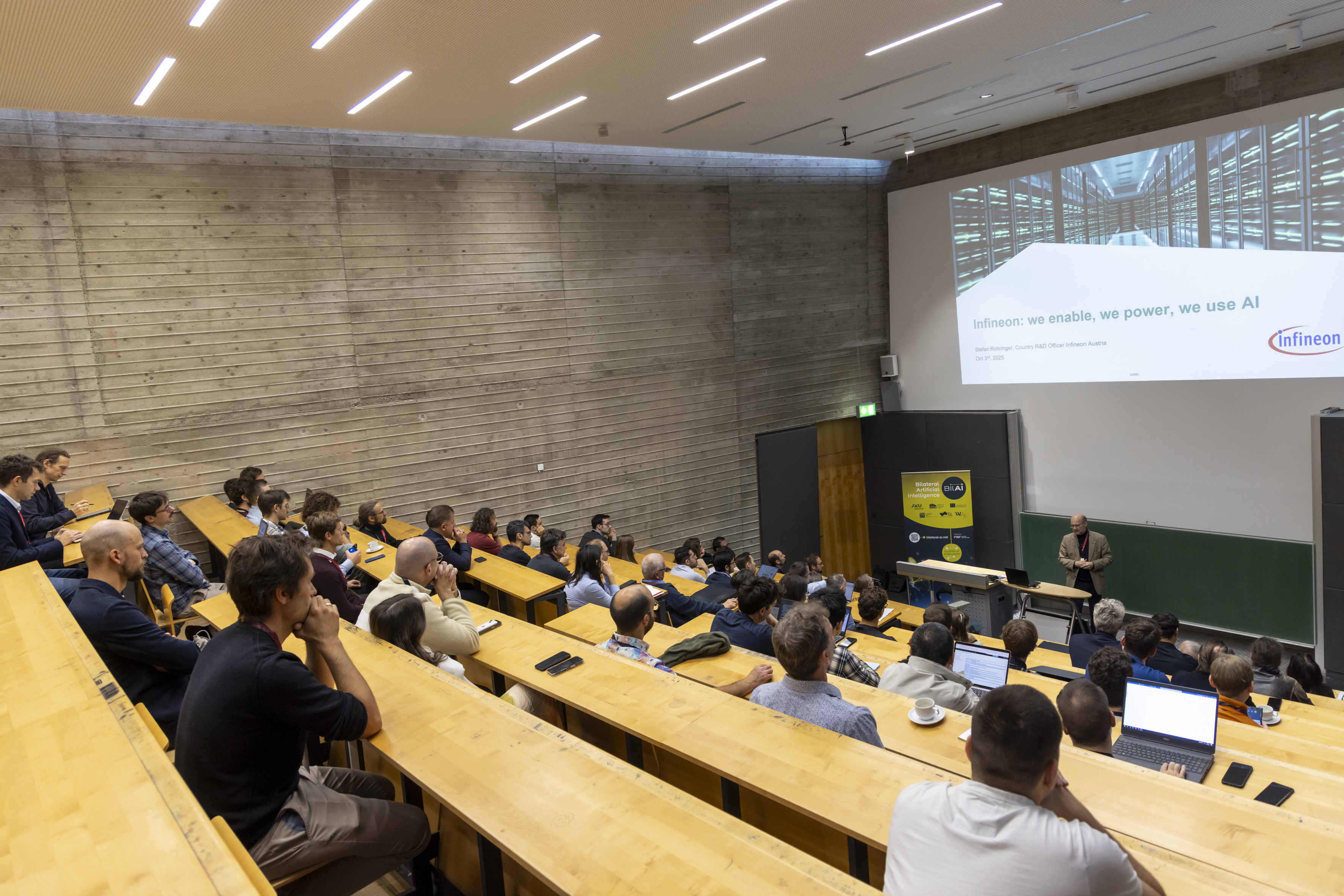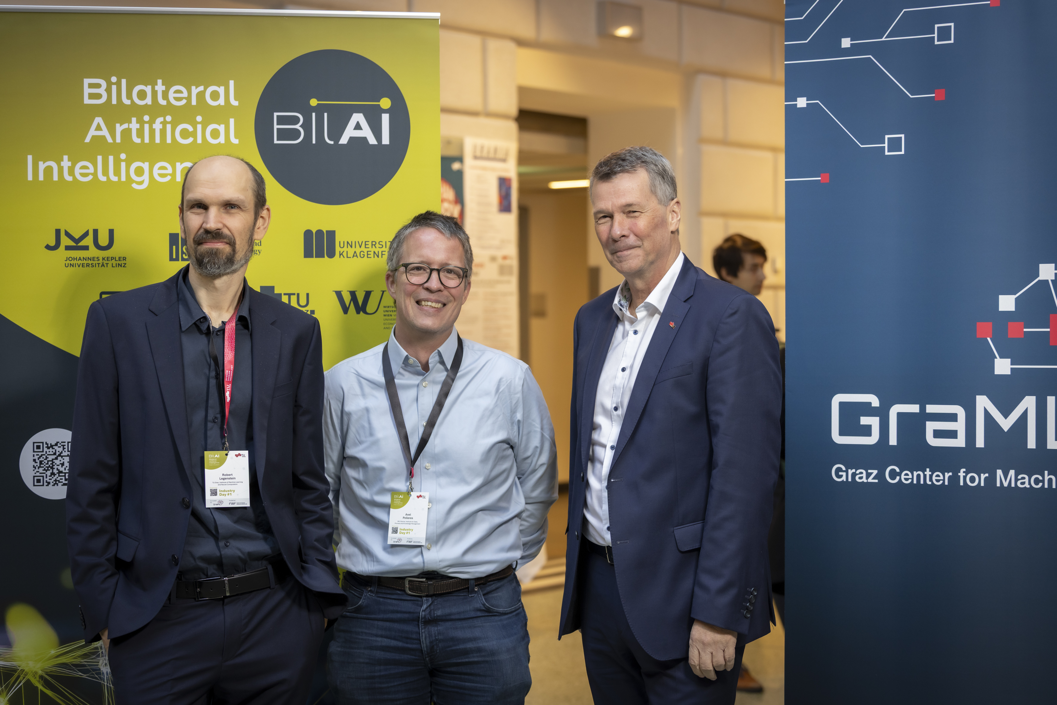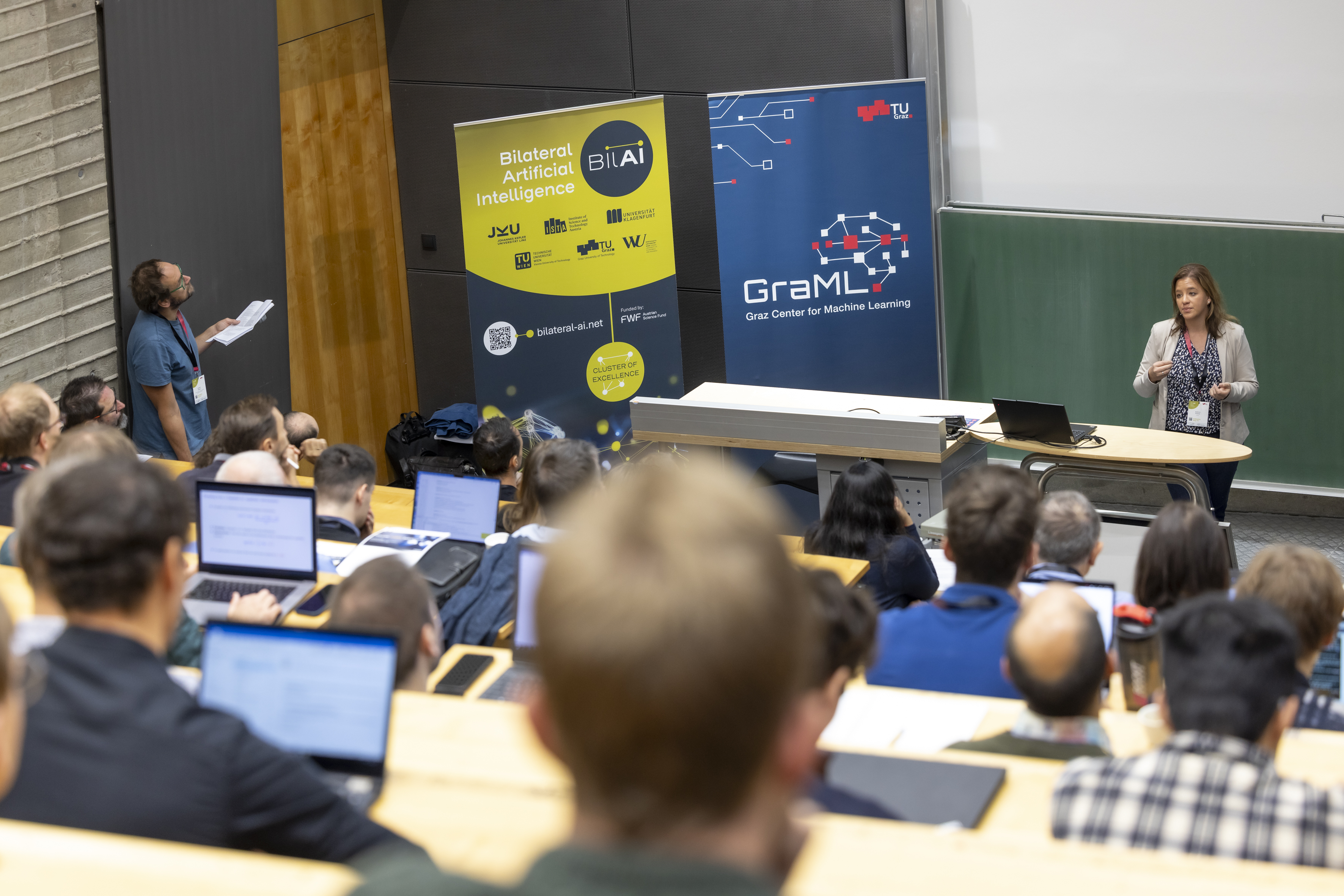 The programme was led by hosts such as Robert Legenstein (TU Graz, BilAI) and Robert Peharz (TU Graz, GraML) as well as Horst Bischof (Rector TU Graz). The day included keynote talks by Stefan Rohringer (Infineon Austria) and Fabian Paischer (emmi.ai), plus lightning talks from contributors such as Kathrin Preiner (Fronius), Herwig Schreiner (Siemens), Thomas Pock (BilAI & GraML), Andrea Denger (AVL), Dan Alistarh (ISTA), Thomas Neff (Lumalabs.ai) and Axel Polleres (WU Wien), among others.