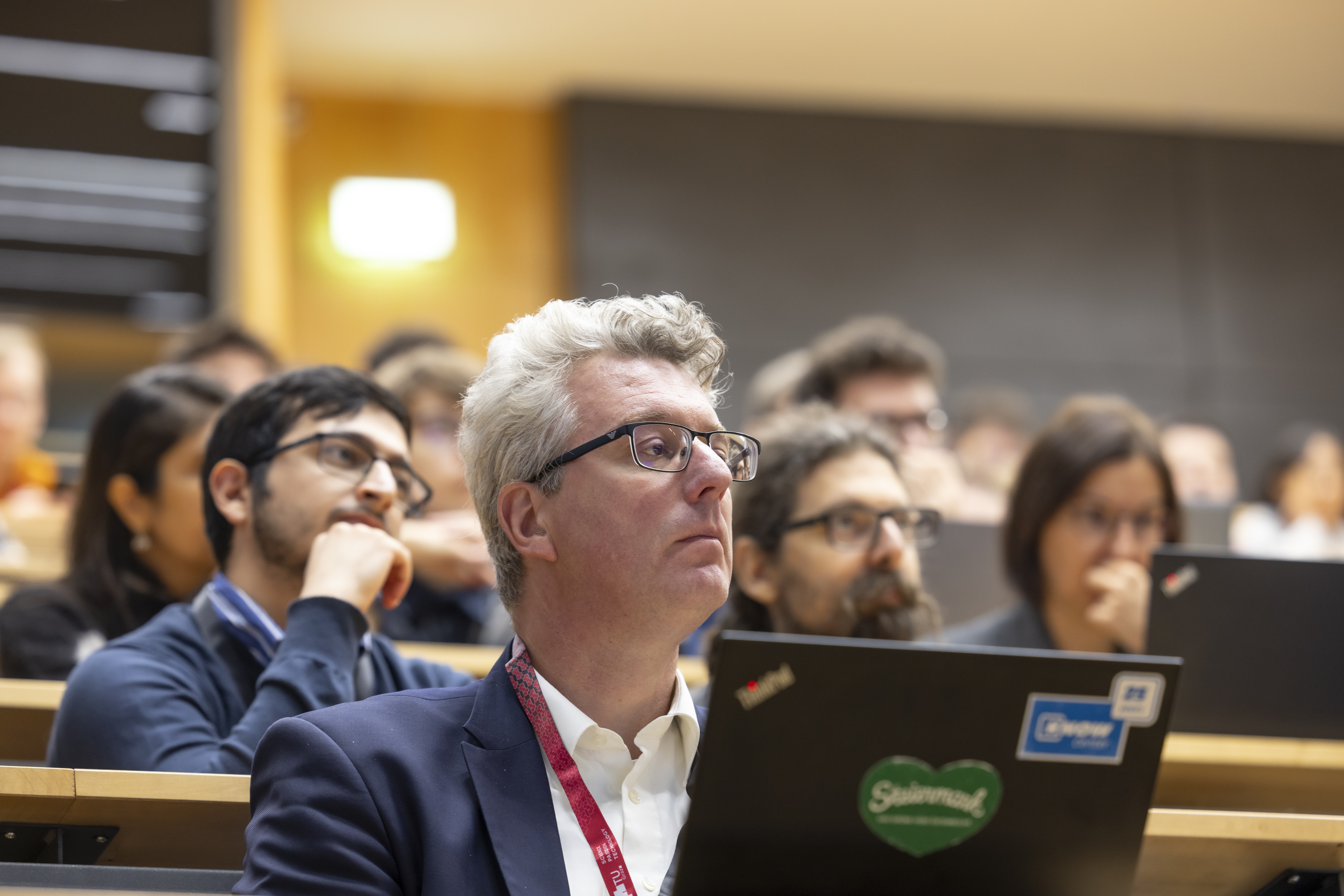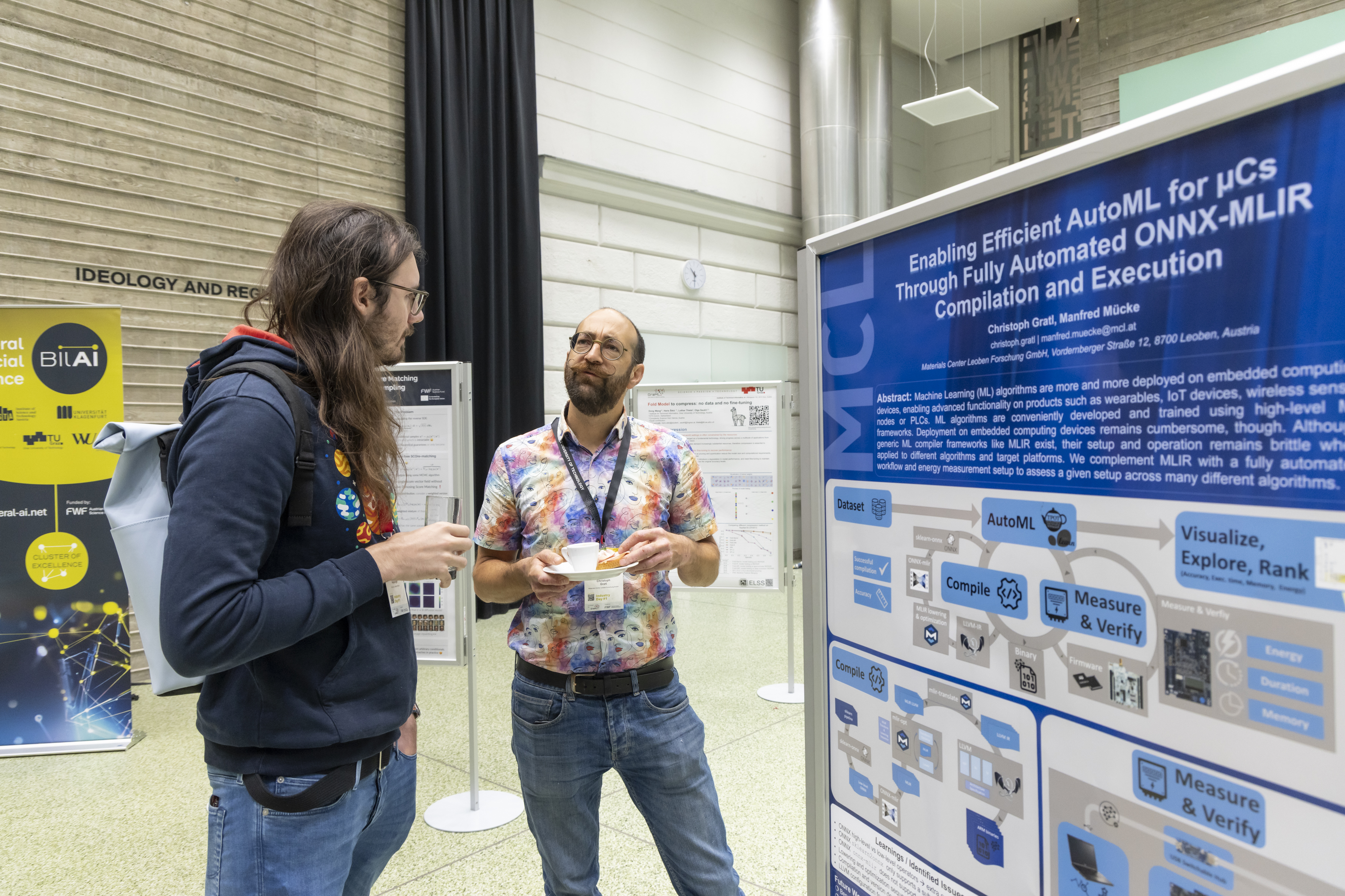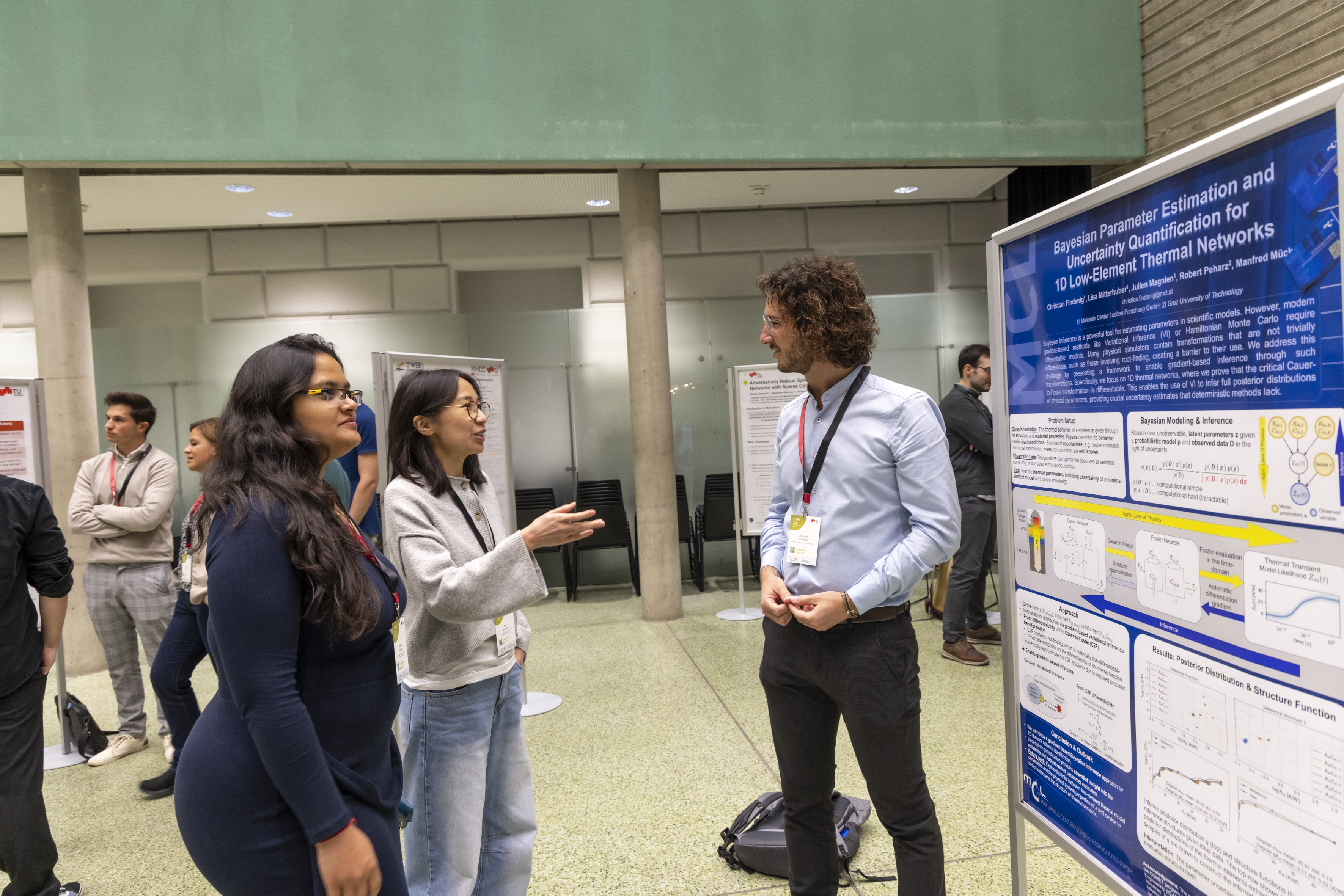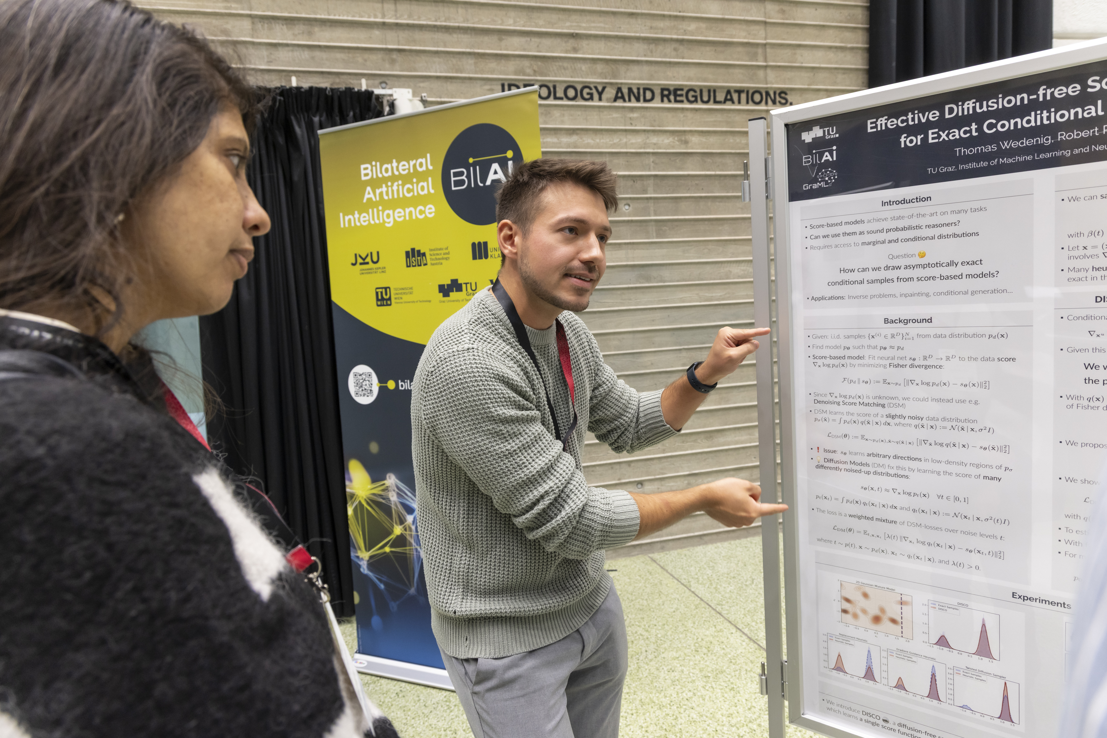 The programme was led by hosts such as Robert Legenstein (TU Graz, BilAI) and Robert Peharz (TU Graz, GraML) as well as Horst Bischof (Rector TU Graz). The day included keynote talks by Stefan Rohringer (Infineon Austria) and Fabian Paischer (emmi.ai), plus lightning talks from contributors such as Kathrin Preiner (Fronius), Herwig Schreiner (Siemens), Thomas Pock (BilAI & GraML), Andrea Denger (AVL), Dan Alistarh (ISTA), Thomas Neff (Lumalabs.ai) and Axel Polleres (WU Wien), among others.